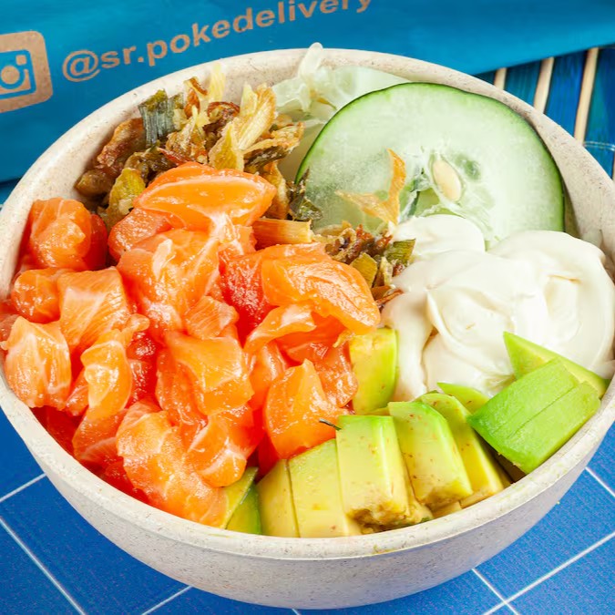 O Poke acompanha: Salmão, Arroz Japonês, Pepino Japonês, Cream Cheese, Abacate e Crispy de Alho Poró.