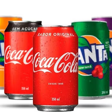 Várias opções para você escolher. Temos Coca-Cola Original, Coca-Cola sem Açúcar, Fanta Laranja, Fanta Uva, Fanta Guaraná, Sprite Original, Guaraná Kuat, Schweppes Citrus e Schweppes Tônica.