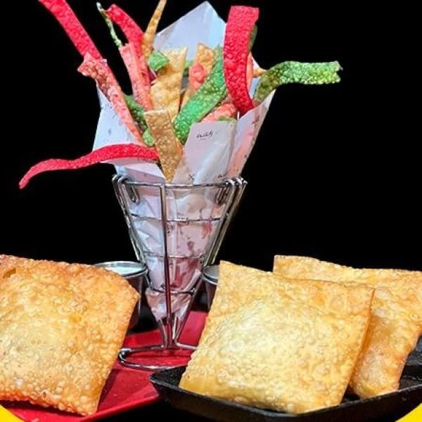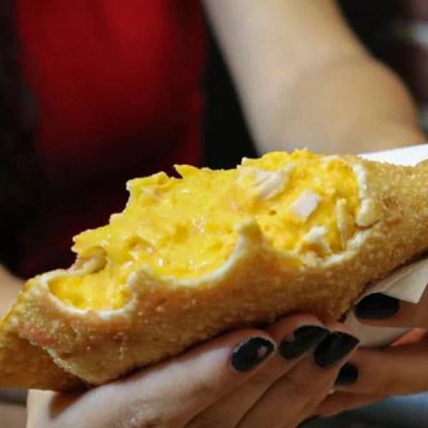 Camarão, Catupiry, alho poró e cebola roxa, com o toque picante da massa apimentada. Tamanho 12cm. Contem Glútem. Massa Apimentada Vegana.