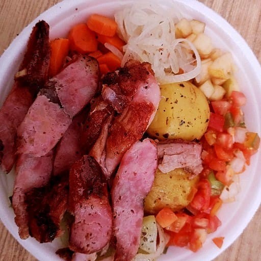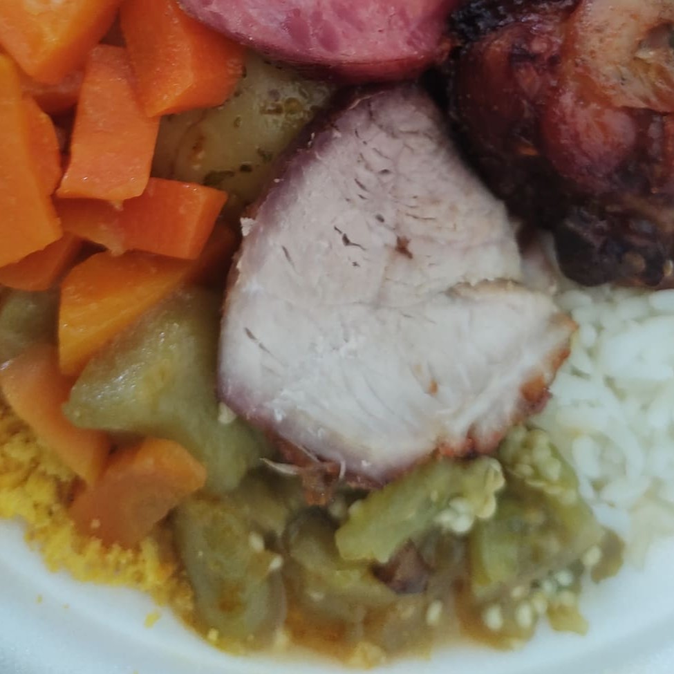 Arroz feijão macarrão batata cozida abobrinha moranga chuchu batata doce repolho batata sote farofa angu Carnes de porco frango e linguiça e boi Monte sua Marmitex com até 5 itens sem com com churrasco