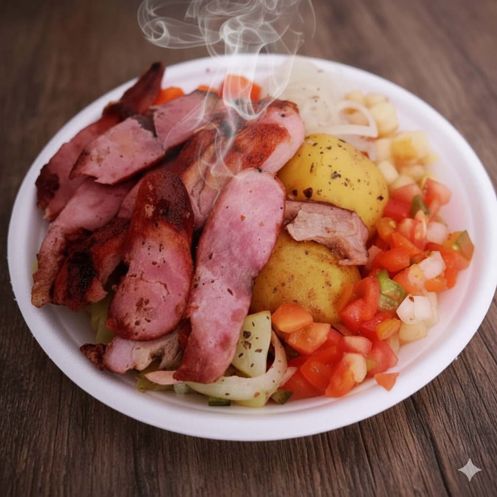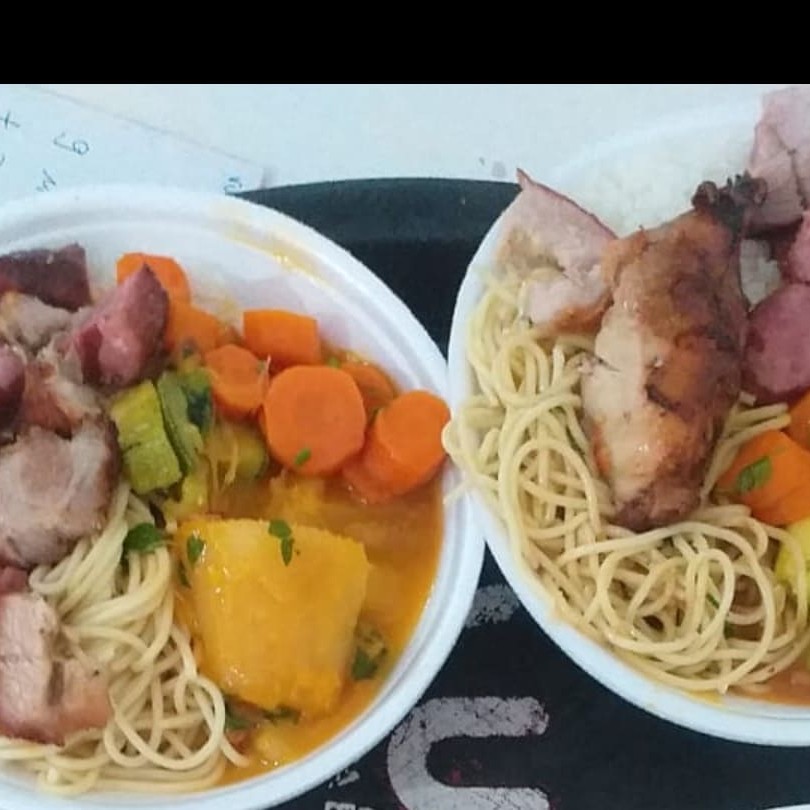 Arroz feijão macarrão com molho ou macarrão alho e óleo batata sote, repolho chuchu cenoura angu churrasco misto Porco Frango e linguiça Monte sua Marmitex com até 5 itens..sem conta com churrasco