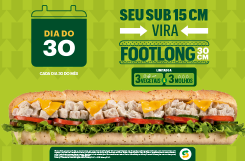 Apenas hoje o Frango Defumado com Cream Cheese de 15cm vira footlong de 30cm. Aproveite!