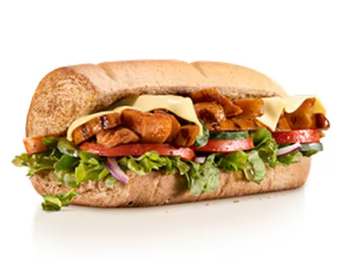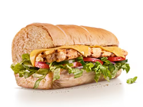 Pão 9 Grãos, Frango Teriyaki em dobro, Mussarela, Alface, Tomate, Cebola Roxa, Molho Cebola Agridoce.