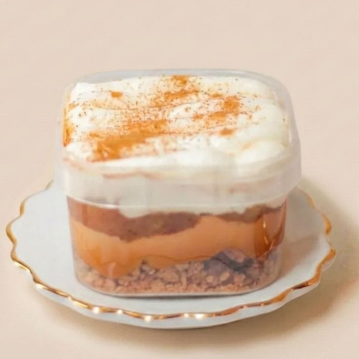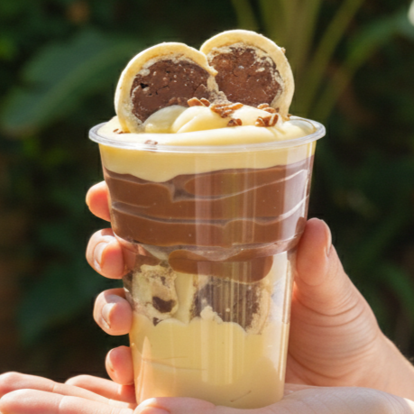 Uma deliciosa sobremesa com base crocante de farofa de bolacha, camada de doce de leite feito com Leite Moça, doce de banana artesanal, nossa mousse branca e com um toque de canela. (MONTADA NO POTE 150ML)