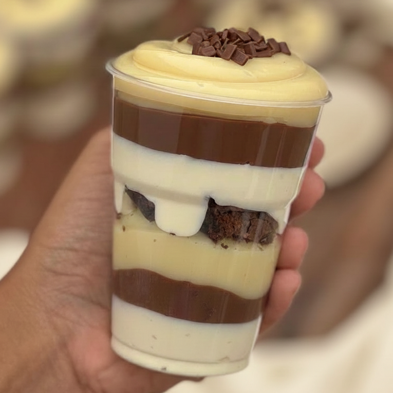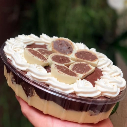 Sobremesa deliciosa montada no pote de 220ml, composta de 3 camadas! São pequenas porções do nosso maravilhoso brigadeiro de colher. Uma explosão de sabores ao comer três texturas e sabores, que são eles: Brigadeiro de chocolate branco Brigadeiro de chocolate blend Mousse branco de Ninho