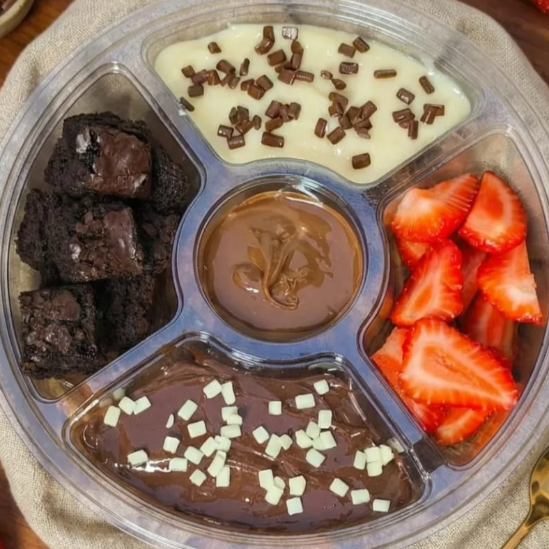 Brigadeiro meio amargo, brigadeiro de leite Ninho, nutella, brownie e morangos frescos.