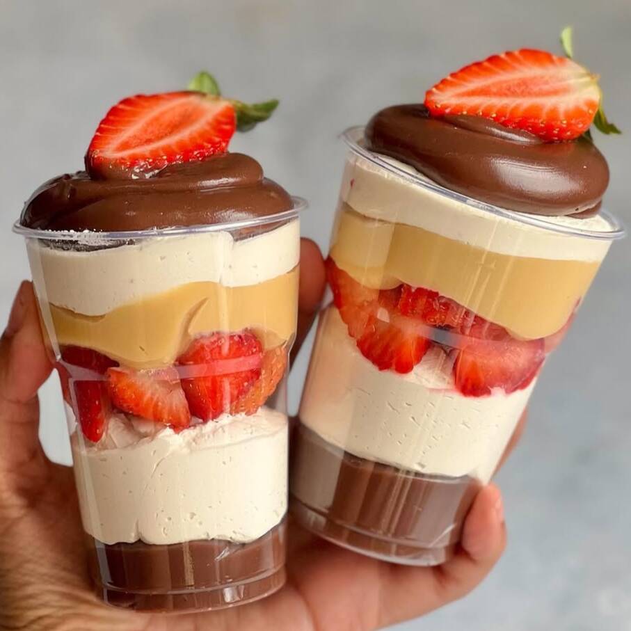 Nosso mais novo copo da felicidade, Sonho de morango! Feito com nosso queridinho e Delicioso mousse de Ninho super leve e saboroso, brigadeiro branco e morangos frescos deliciosos! Tem combinação melhor?
