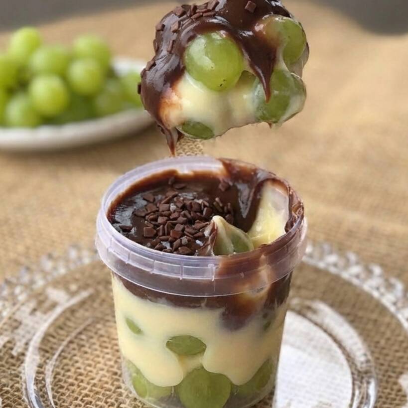 Creme de Ninho, creme de chocolate meio amargo e uvas frescas. (Pote 220ml, aproximadamente 230g)