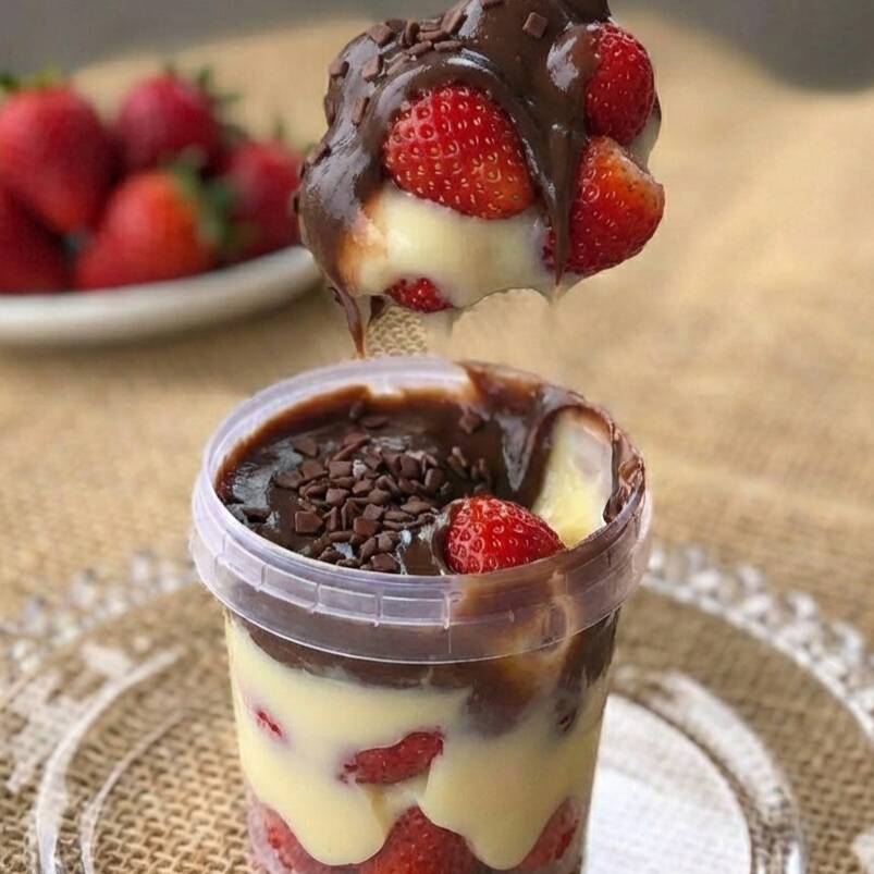 Creme de Ninho, creme de chocolate meio amargo e morangos frescos. (Pote 220ml, aproximadamente 230g)