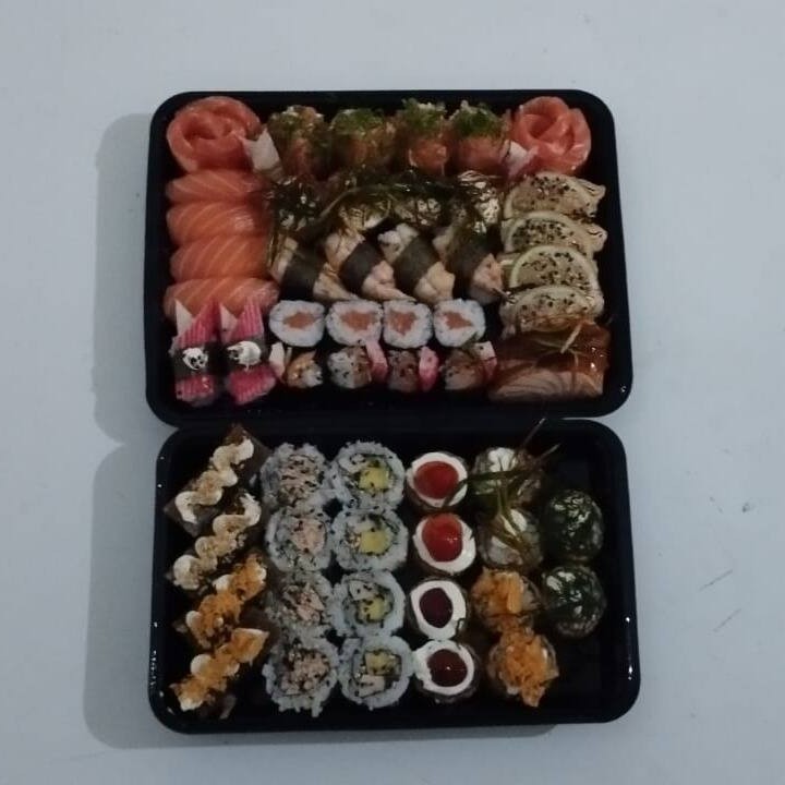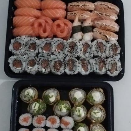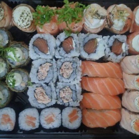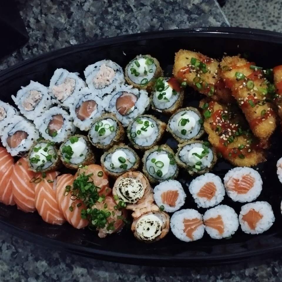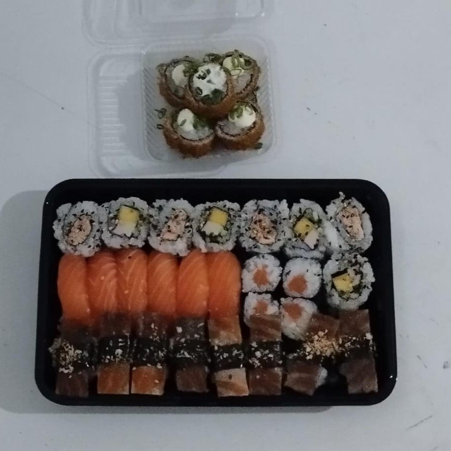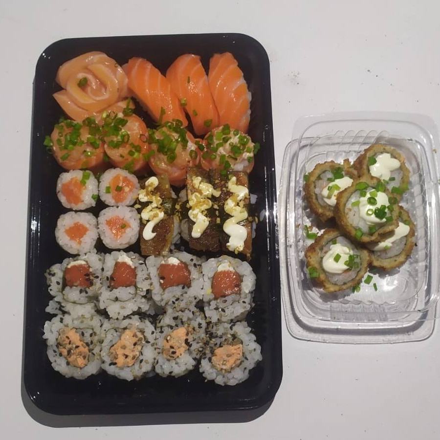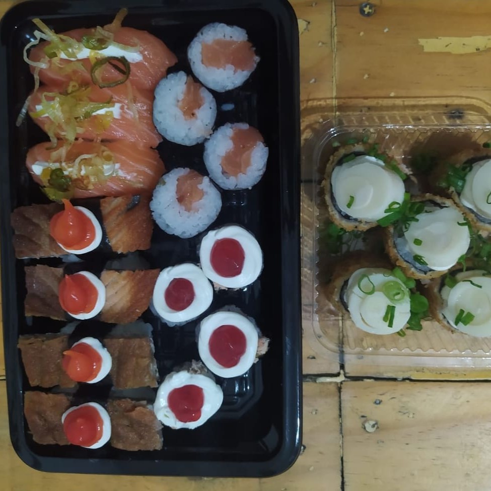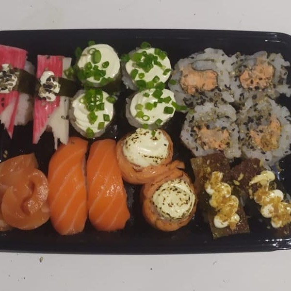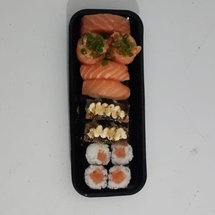 3 - Sashimi de Salmão, 2 - Sushi de Salmão, 2 - Sushi de Kani, 2 - Sushi Skin, 2 - joy roll, 4 - Maki Filadélfia, 4 - Uramaki Salmão grelhado