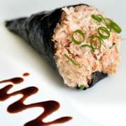 Fatia de Salmão, Bolinha de Arroz e Tartare de Salmão