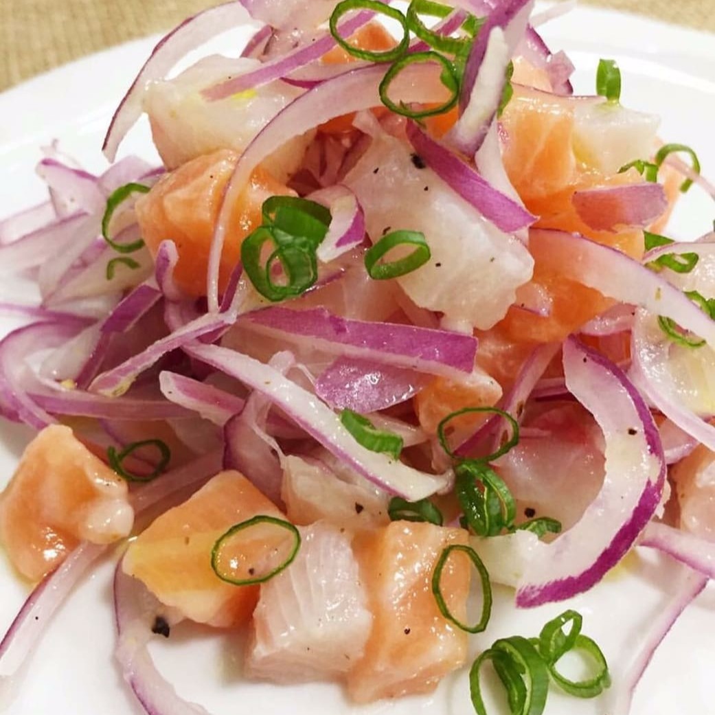 Salmão, kani, camarão, cebola roxa, cebolinha, suso de limão e temperos