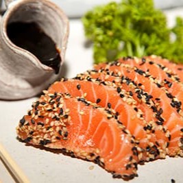 Fatia de salmão selado com gergelim ao molho limão e laranja