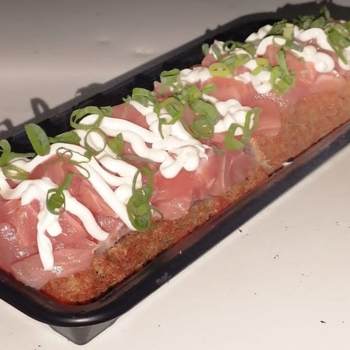 Arroz japonês, Salmão em cubos, crispe de alho poró, sonomono, cebola roxa, nori, molho Teriaki e molho de Pimenta Sweet Chille