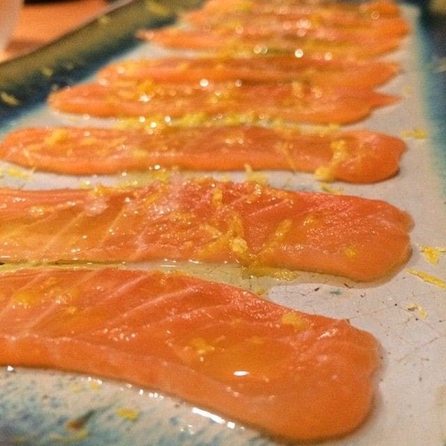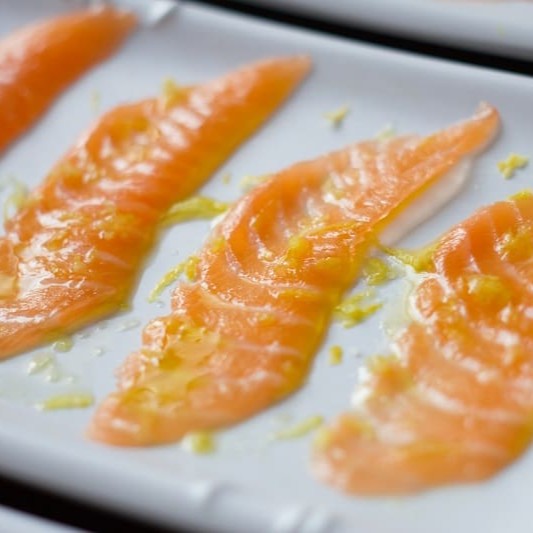 Fatia de salmãao, raspa de limão siciliano, azeite cítrico e flor de sal