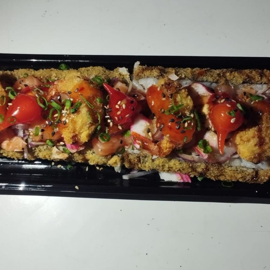 Salmão, camarão empanado, cebola roxa, cebolinha, kani, pimenta biquinho, geleia de pimenta