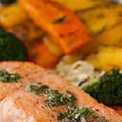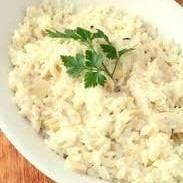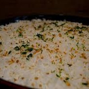 Arroz, legumes na manteiga, alcaparras e molho de ervas.