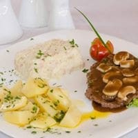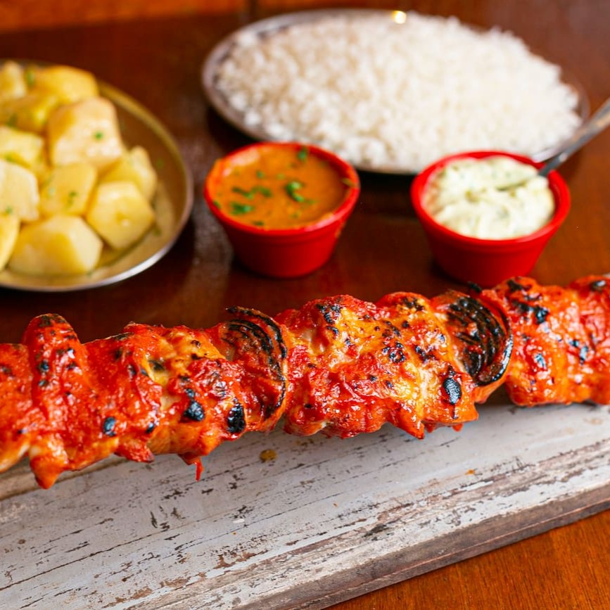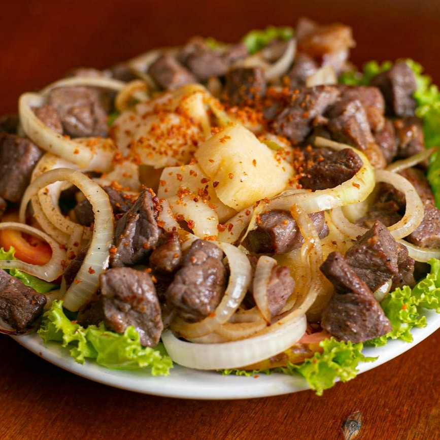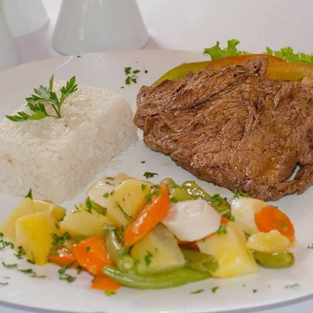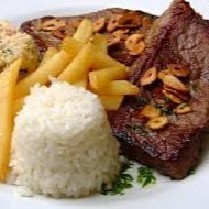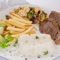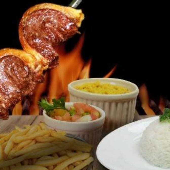 400 grs picanha, 300 grs lombo, 300 grs filé de frango, arroz branco, tropeiro, fritas, vinagrete salada ( alface,tomate,palmito,cenoura, cebola e pimentão)