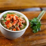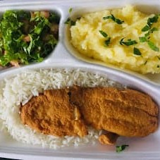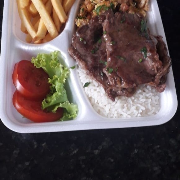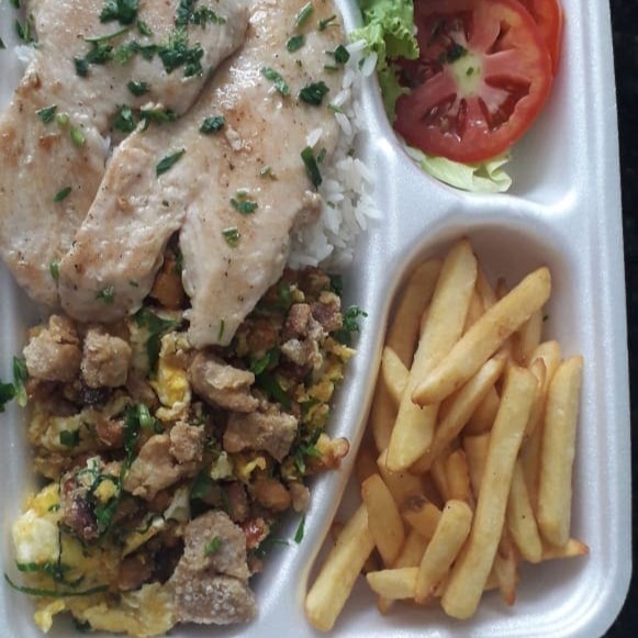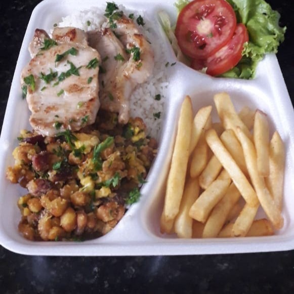 Arroz branco, fritas, feijão tropeiro,salada (alface e tomate)