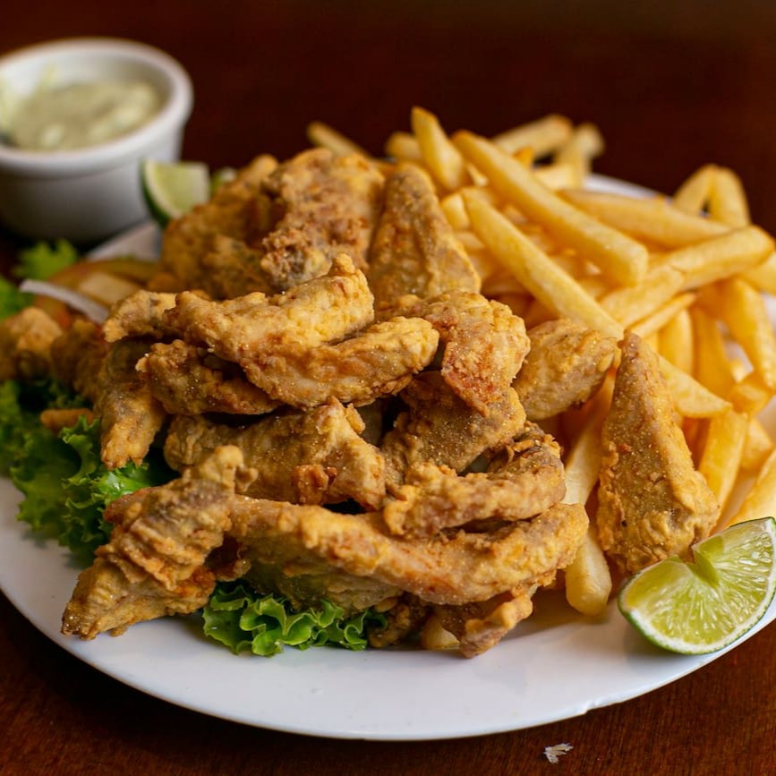 Com fritas e molho de ervas. 300 g de isca/ 300g de fritas