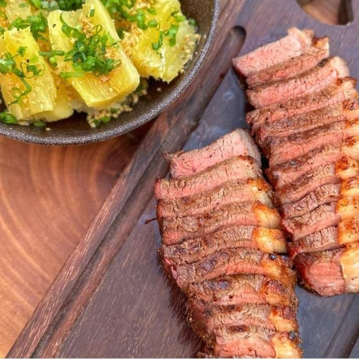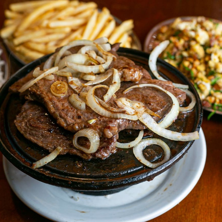 Picanha maturada, lombo, arroz, tropeiro, fritas e vinagrete.