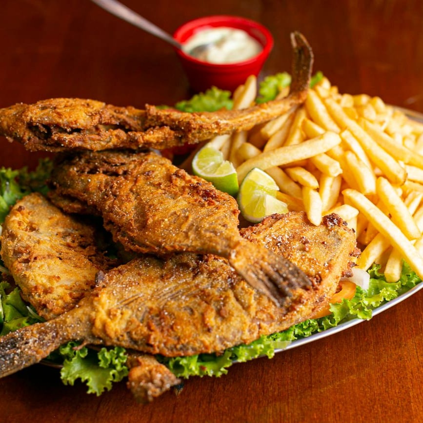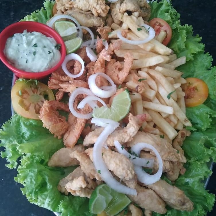 250 grs camarão, 250 grs tilápia,250 grs traíra, 350 grs fritas