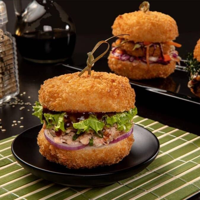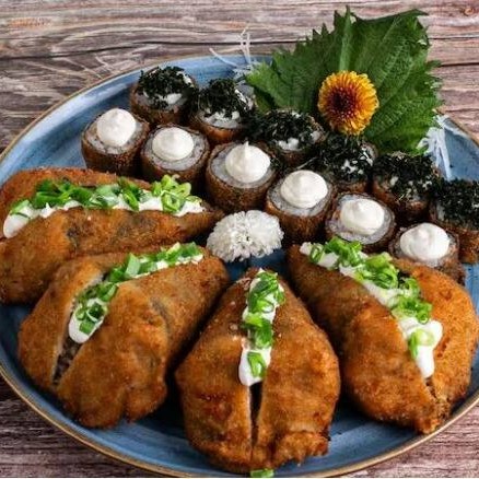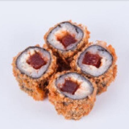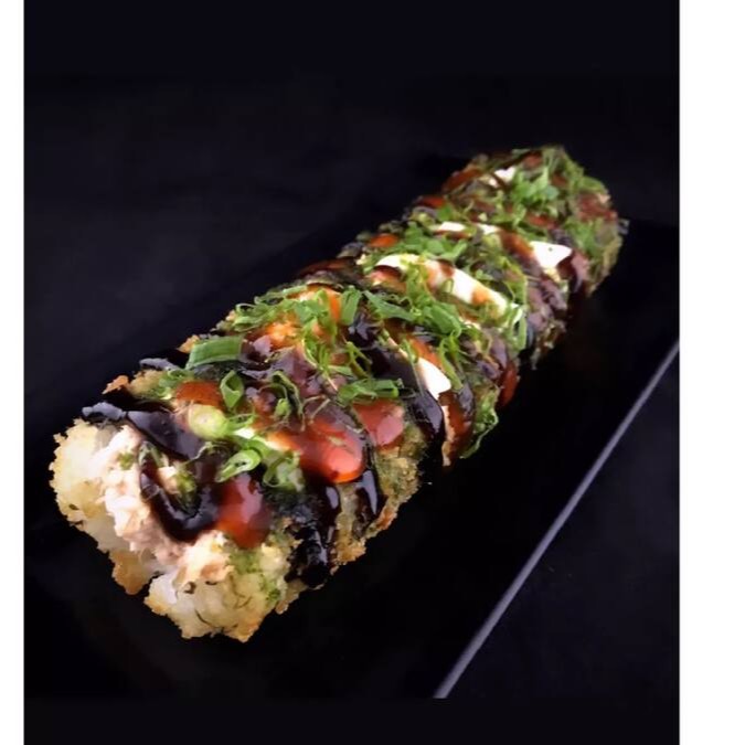 Maki de salmão grelhado empanado e frito com tartar de atum com geleia de pimenta , creamcheese e cebolinha