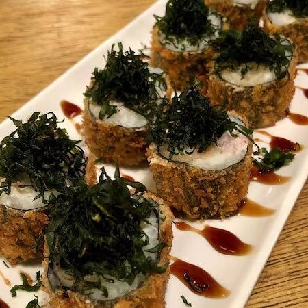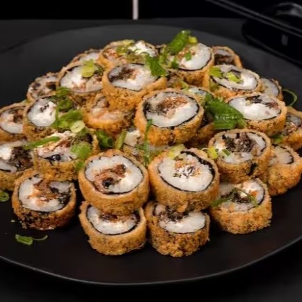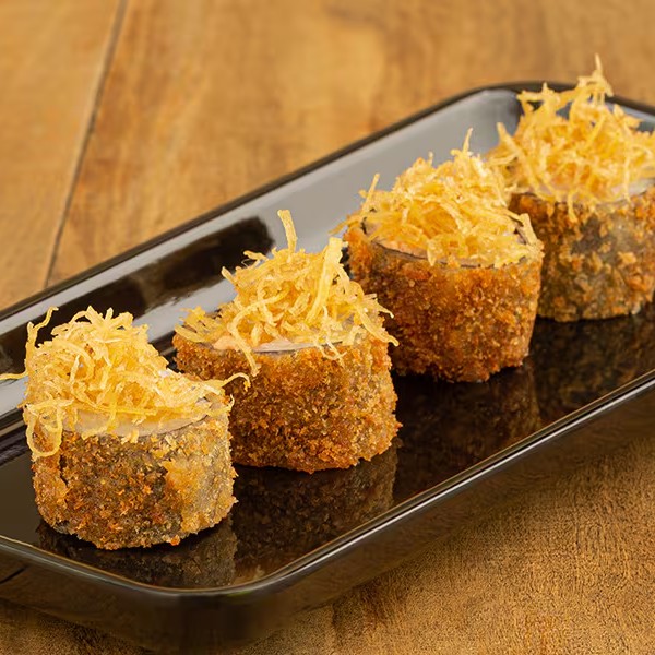 Maki de salmão grelhado empanado e frito com creamcheese e crispy de alho poro