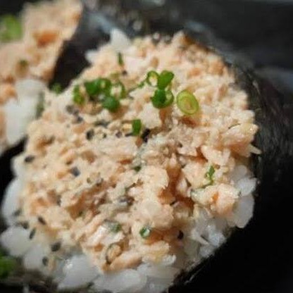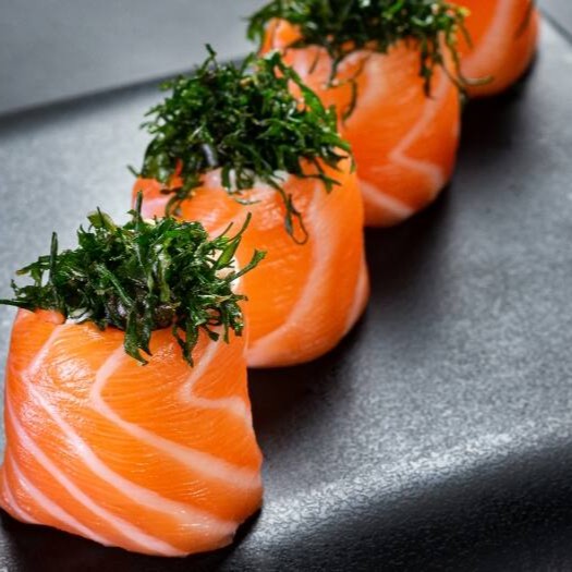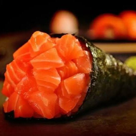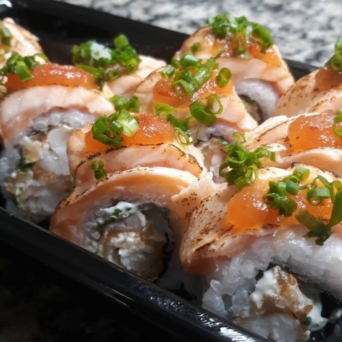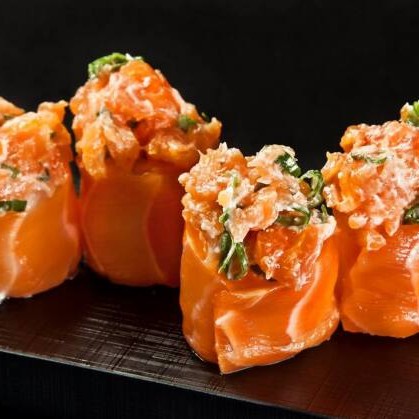 Sashimi de Salmão envolvido em arroz, com cobertura de salmão cream chesse e cebolinha.