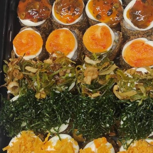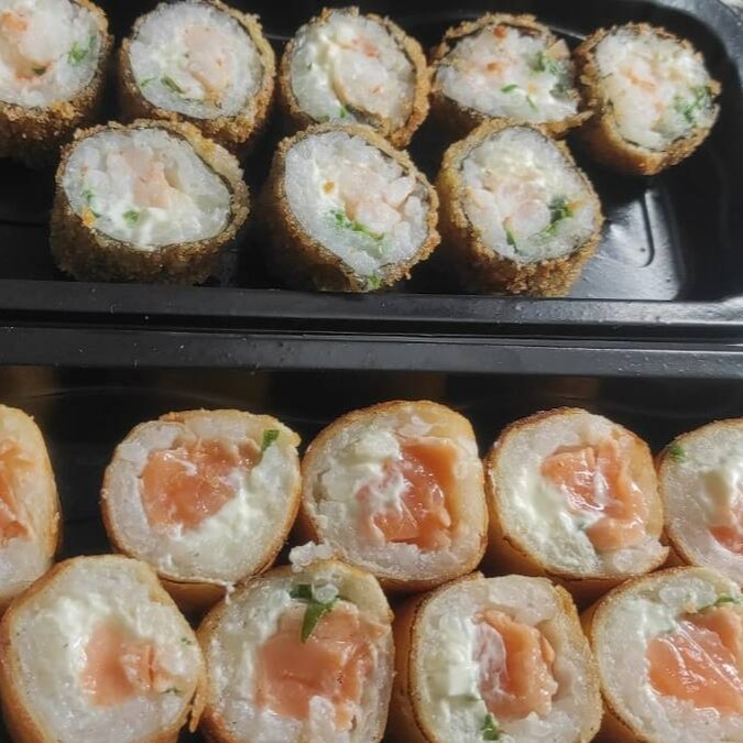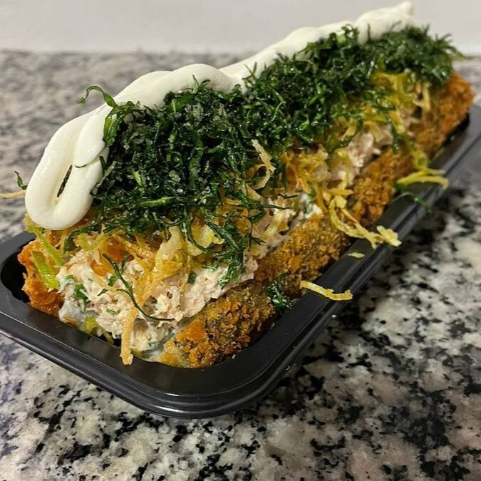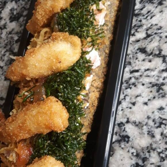 Enrolado de alga em forma de cone, empanado e frito nas opções, camarão,
