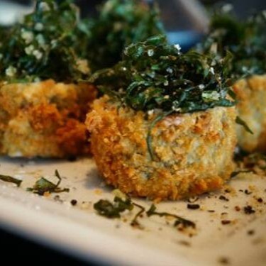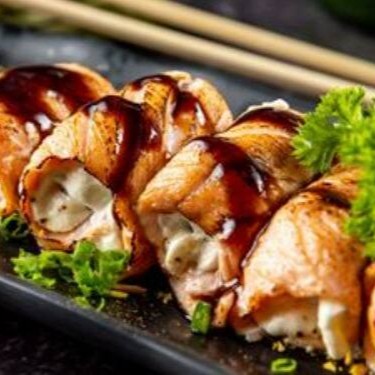 Sashimi de Salmão envolvido em arroz, com cobertura Cream Chesse e Crispe De Couve