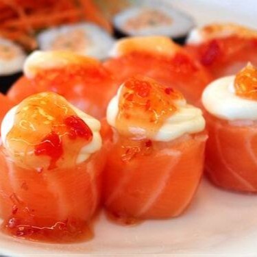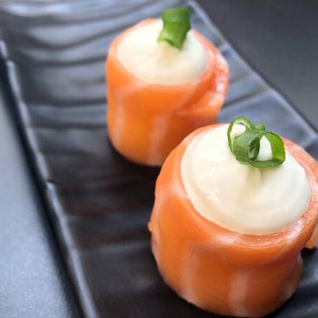 Sashimi de Salmão envolvido em arroz, com cobertura Cream Chesse e cebolinha.