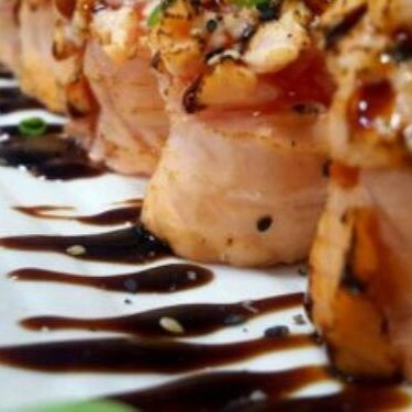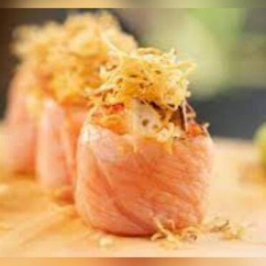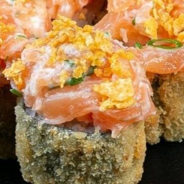 Sashimi de Salmão envolvido em arroz, com cobertura Cream Chesse e Crispe De Alho Poró
