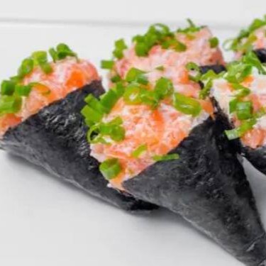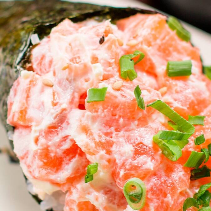 Enrolado de alga em forma de cone recheado com arroz, salmão Grelhado, Cream Chesse e Cebolinha