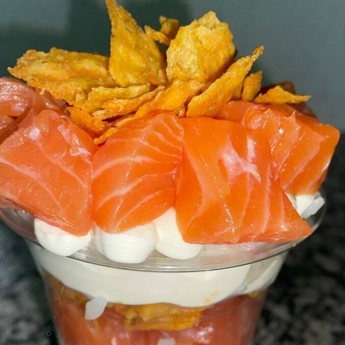 Experimente o 'Copo da Felicidade Doritos ' Imagine um temaki artesanalmente montado em camadas estratégicas: começa com uma base de salmão fresco, seguida por uma camada de arroz de sushi, Depois, mais uma camada de salmão em cubos fresco é adicionada, seguida pelo nosso irresistível Doritos crocante. Seguida por mais salmão em cubos e uma porção adicional de Doritos. Para finalizar, nosso tarê infinito, adicionando um sabor doce e salgado que irá surpreender o seu paladar.