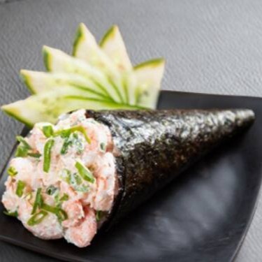 Enrolado de alga em forma de mini cone recheado com arroz, Camarão,