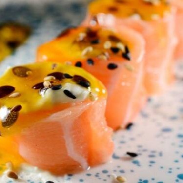 Sashimi de Salmão envolvido em Pele de Salmão Crocante Cream Chesse, Maçaricado e finalizado com geleia de Maracujá e taré