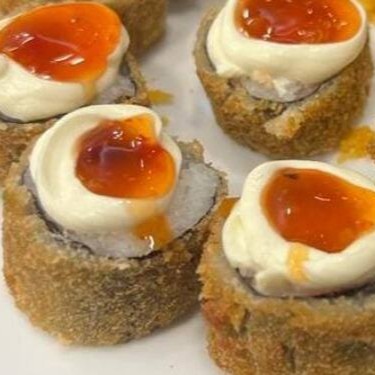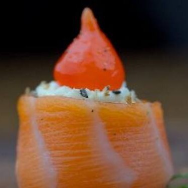Sashimi de Salmão envolvido em camarão empanado e frito com cream chesse, maçaricado e finalizado com geleia de pimenta e taré.