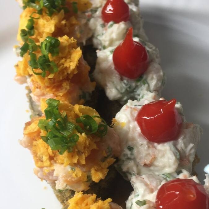 Sashimi de Salmão envolvido em arroz, com cobertura Cream Chesse e Doritos