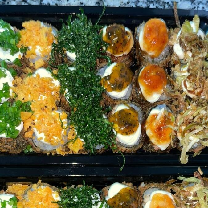 Apresentamos o nosso 'Hot de Bacon (Maravilhoso) 8 uni', uma novidade irresistível do Sushi Hub. Este hot é primorosamente recheado com skin e revestido com uma generosa camada do nosso cremoso cream cheese. Mas o destaque do prato é a farofa de bacon, crocante e intensamente saborosa, que cobre o hot com maestria. A finalização fica por conta do nosso exclusivo tarê da casa, que adiciona um toque de doçura e sofisticação. Uma experiência gastronômica única, que vai despertar todos os seus sentidos.