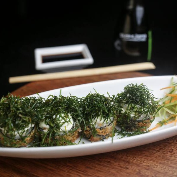 Maki de salmão, cebolinha e cream cheese empando na panko e frito. Por cima crispy de couve.