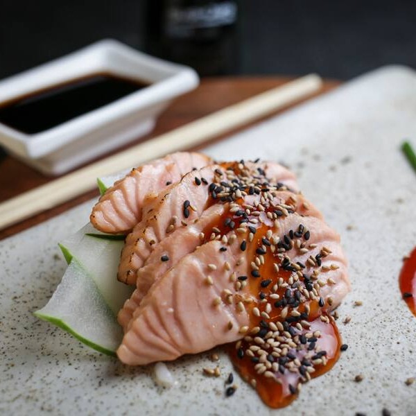 Salmão selado, gergelim, sweet sauce
