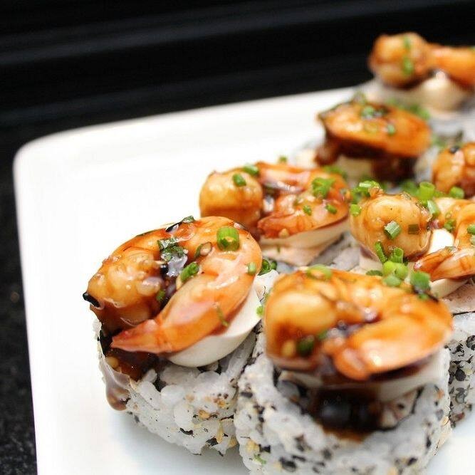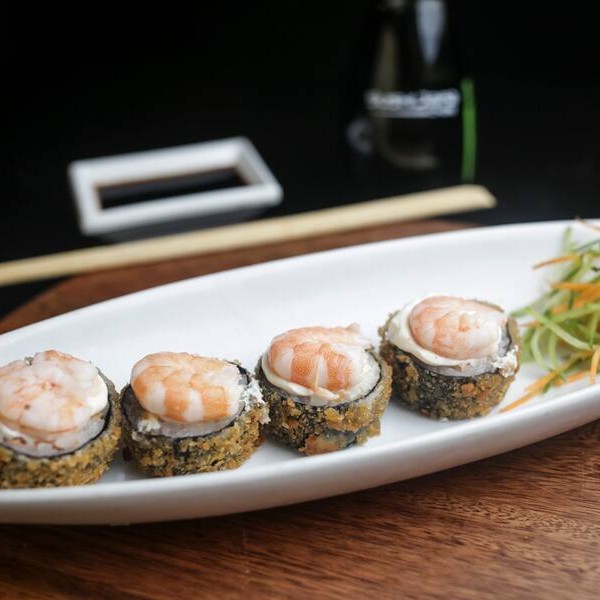 Maki de salmão, cebolinha e cream cheese empando na panko e frito. Por cima camarão.