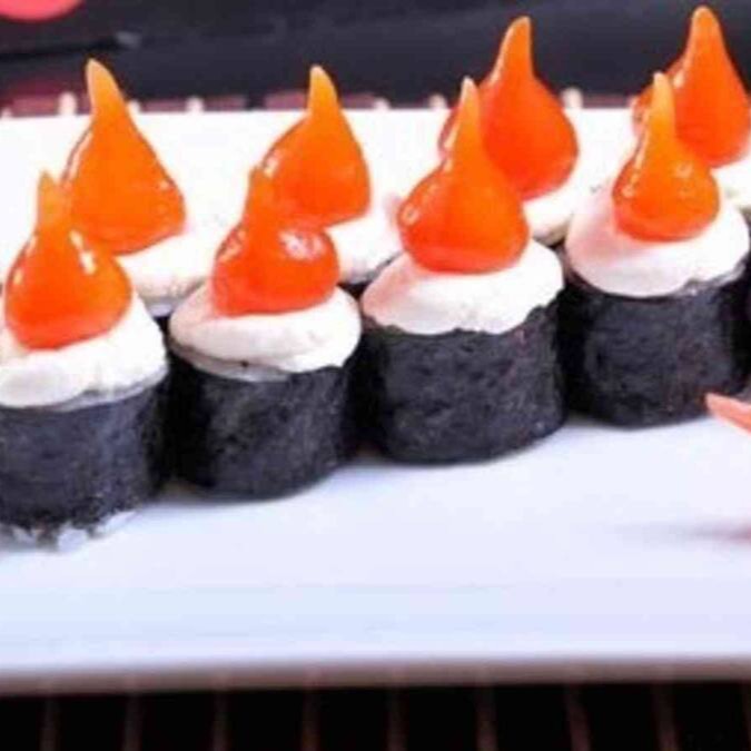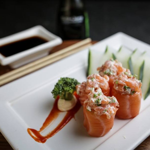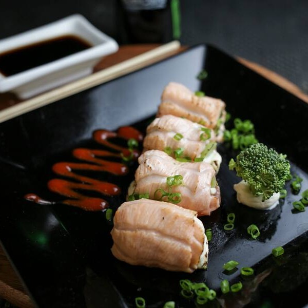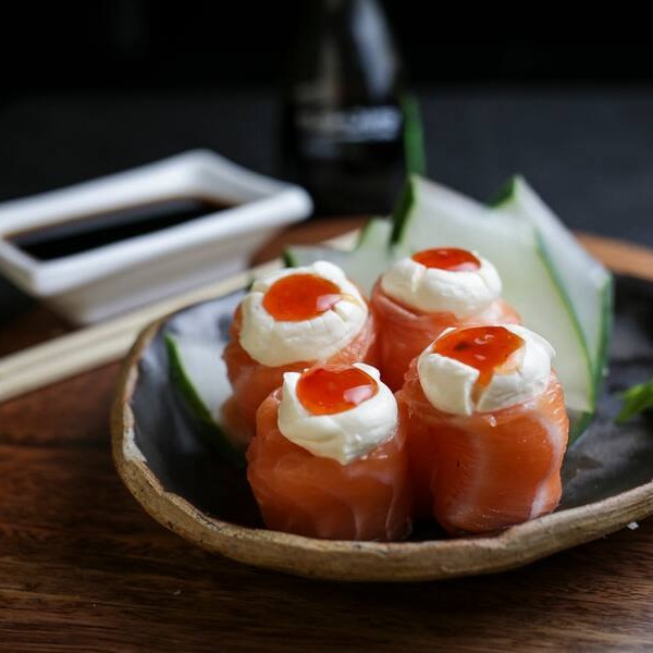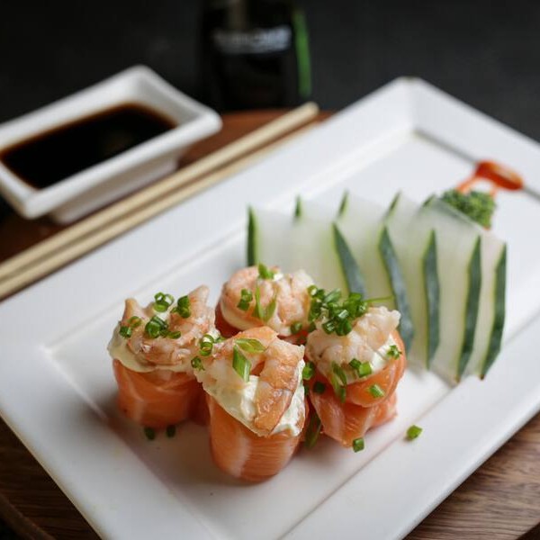 Camarão com cream cheese enrolado com salmão maçaricado
