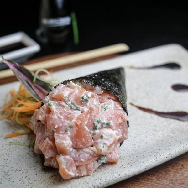 Roll de salmão e arroz com tartar de salmão, cream cheese e cebolinha .