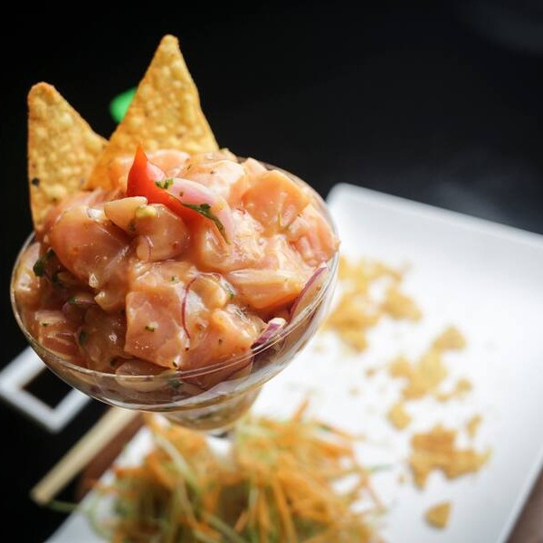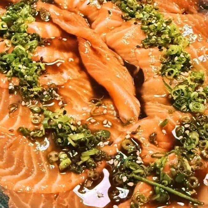 16 Laminas de salmão ao molho cítrico finalizado com cebolinha
