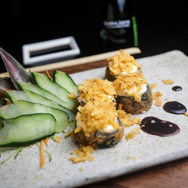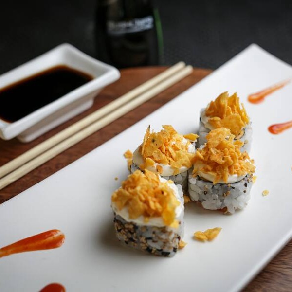 Maki de salmão, cebolinha e cream cheese empando na panko e frito. Por cima Doritos.