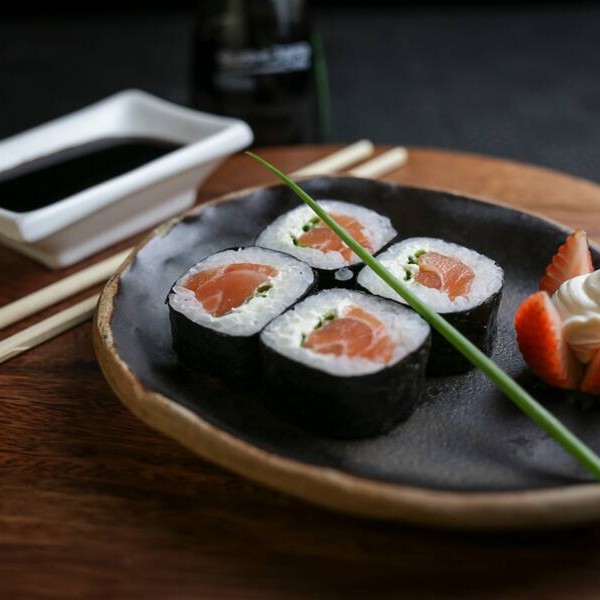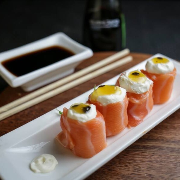 Rol de salmão e arroz com recheio de cream chesse e molho de maracujá.