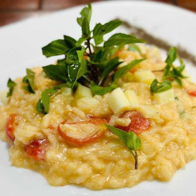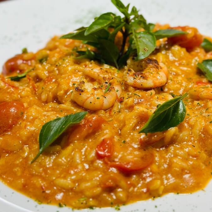 Risoto de camarão grelhado, flambado em vinho branco, tomate cereja, molho pomodoro e manjericão fresco.