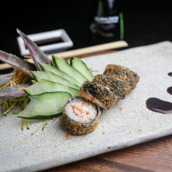 Maki de salmão com cream cheese e cebolinha empanado na panko e frito.
